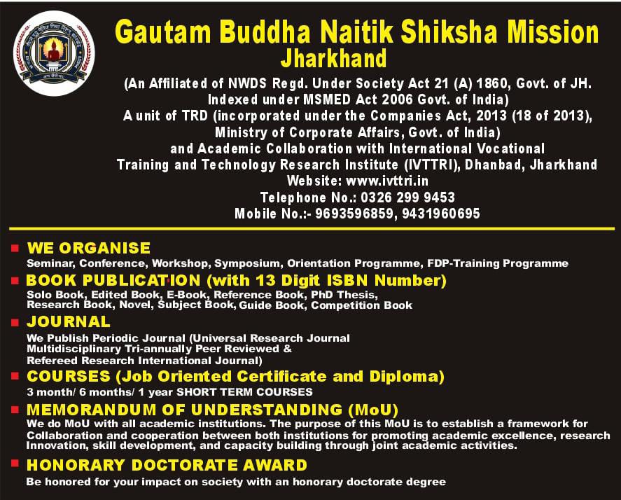 The objectives of Gautam Buddha Naitik Shiksha Mission (GBNSM), Jharkhand is to providing educational and research assistance to scholars afflicted by lower research system.